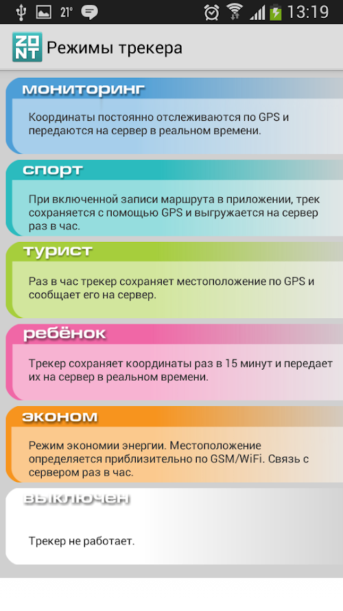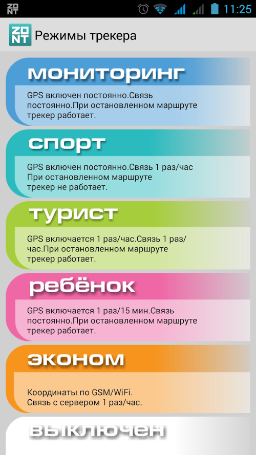 Мы постарались сделать приложение ZONT Трекер универсальным и способным решать различные задачи: контролировать детей и пожилых людей, анализировать работу торговых представителей и курьеров, фиксировать спортивные тренировки, туристические маршруты и так далее. Для каждой задачи оптимизированы разные режимы работы: