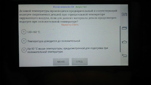The application is designed for self-testing. Studied the theory of welding production, testing themselves on knowledge. When the test result is displayed: test or passed or not passed, the number of errors, number of questions, the question itself, in which mistakes were made. In the settings can determine for itself the number of errors in a percentage from 0 to 100, the number of questions from 1 to 218. The test is carried out at a time; from start to finish. You can not use the "Back" button and re-answer the previous question. At any time you can exit the menu, see the error and restart the test.