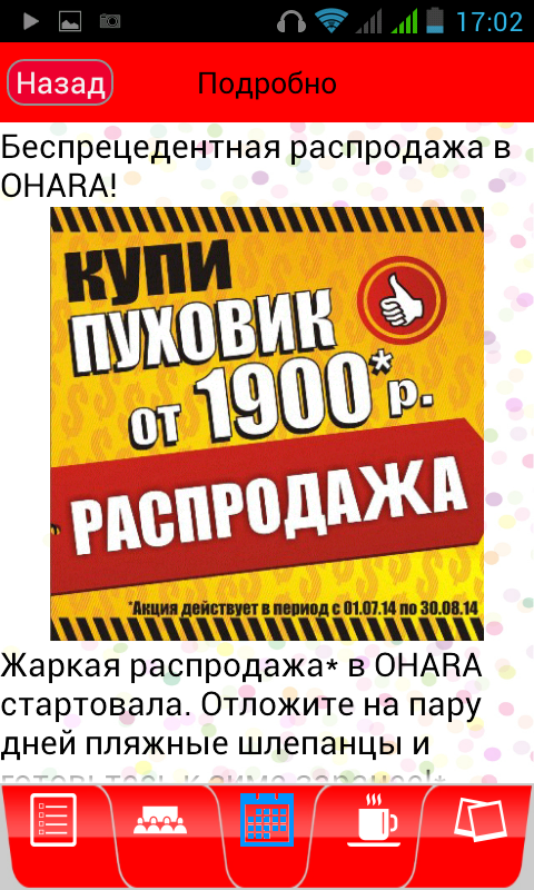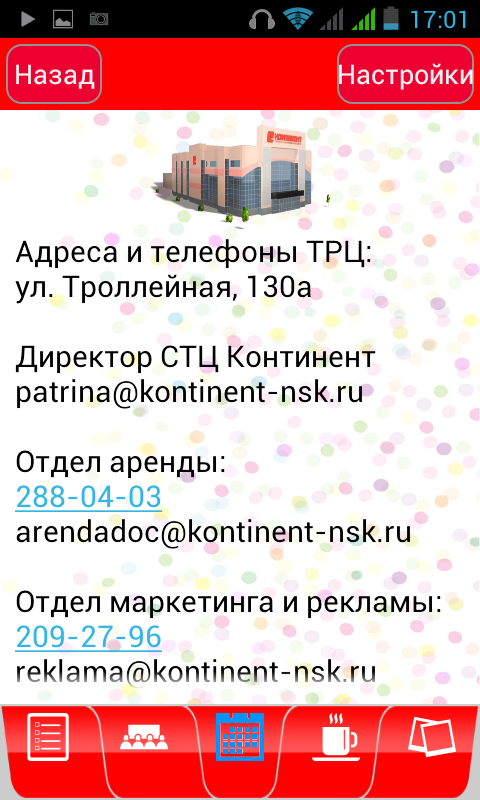 Бесплатное приложение "ТРЦ "Континент" Новосибирск – предоставит Вам всю необходимую информацию о магазинах, ресторанах и кафе находящихся в наших торговых центрах, оперативно ознакомит пользователя, с выгодными акциями и скидками, предстоящими мероприятиями и точным расписанием работы кинотеатров. Так же, для вашего удобства, в приложении представлены планы торговых центров, с помощью которых, Вы сможете без труда отыскать все необходимые товары и услуги, ознакомиться с контактными данными и описаниями всех представленных магазинов ресторанов и кафе. Приложение «ТРЦ Континент» призвано обеспечить удобство и комфорт покупателей, простоту получения любой необходимой информации связанной с нашими торговыми центрами. «Континент» - география удачных покупок!Free app "SEC" Continent "Novosibirsk - will provide you with all the necessary information about the shops, restaurants and cafes are in our shopping malls, quickly familiarize the user with the profitable stocks and discounts, upcoming events and the exact schedule for the theater. Also, for your convenience in annex outlines plans shopping malls, with the help of which you can easily find all the necessary products and services available with contact details and descriptions of all the shops and restaurants and cafes. Annex "SEC Continent" is intended to provide comfort and convenience of customers, ease of obtaining any necessary information relating to our shopping centers. "Continent" - geography good shopping!