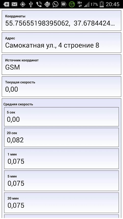 Приложение определяет координаты, адрес, текущую скорость, а также вычисляет среднюю скорость в рамках нескольких временных интервалов