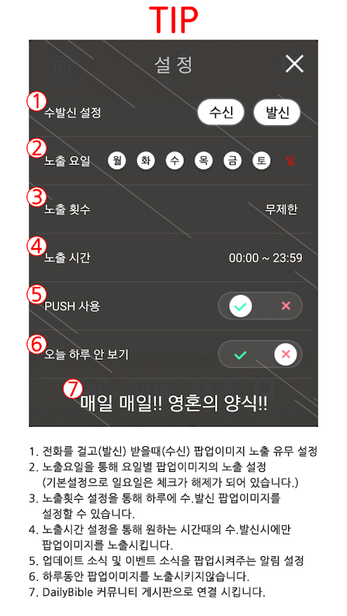 ※ 활용방법 3 : 설정을 통해 말씀이 노출되는 요일, 시간, 횟수 등이 조절 됩니다.