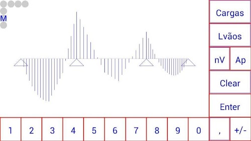 gráficos do momento fletor e da força cortante. Fornece o valor do momento máximo e o