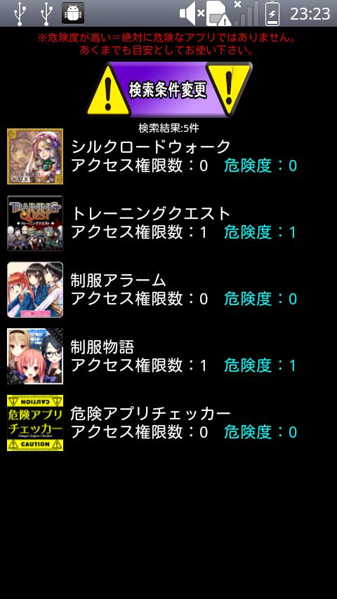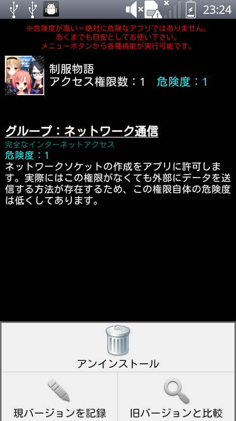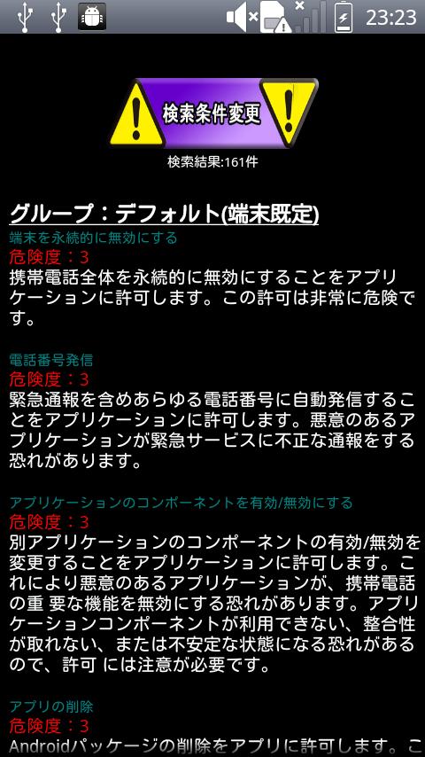 The number of rights that are used for each installed application, the total value of the degree of risk for the authority we have displayed some. The contents of the transition to more authority to the detail screen when you touch the displayed app will be displayed.