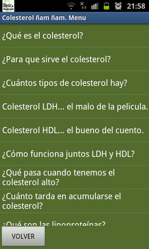 Esta App te permite saber el contenido en colesterol de cualquier alimento. Tengo el colesterol alto y a veces estoy en un restaurante o cafetería y no se que contenido en colesterol tiene un alimento. Con esta aplicación sabrás, de forma amena, si puedes tomar o no un alimento o bebida. Ademas incluye una explicación sencilla de que es el colesterol, como funciona, etc.This app lets you know the cholesterol content of any food. I have high cholesterol and sometimes I'm in a restaurant or cafe and no cholesterol content of a foodstuff. With this you will know, applying an entertaining, if you can not take either food or drink. It also includes a simple explanation of what cholesterol is, how it works, etc.