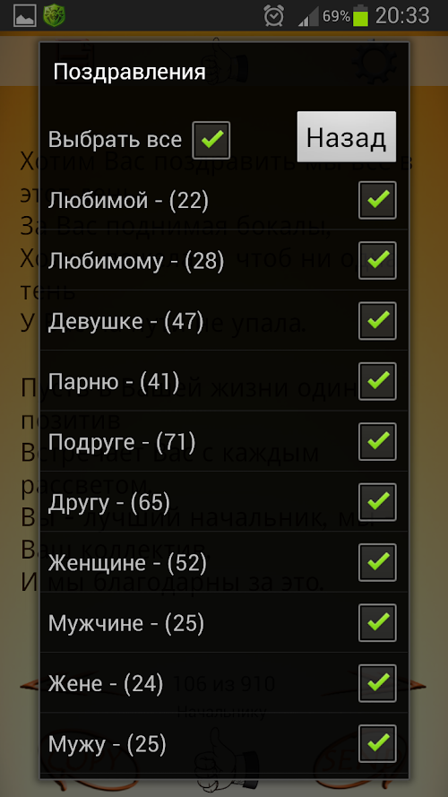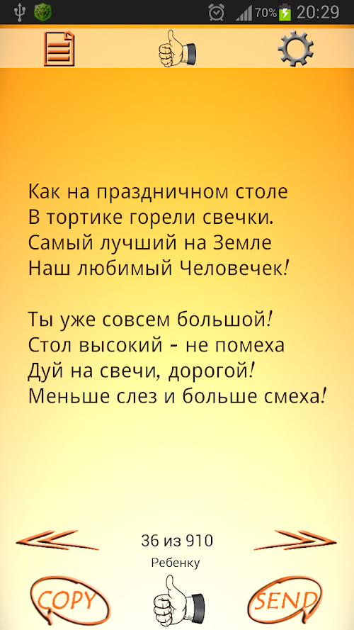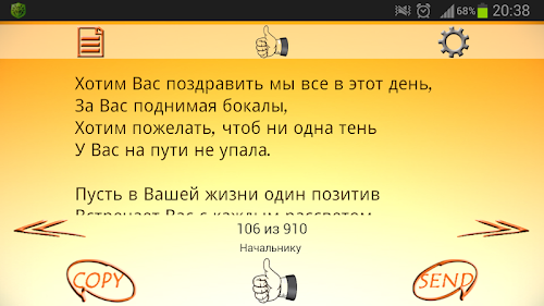 Понравившееся поздравление можно легко послать на смс, скопировать в буфер, добавить в избранное, вконтакте, одноклассники и т.д. (любое установленное на телефоне приложение, которое принимает текст)