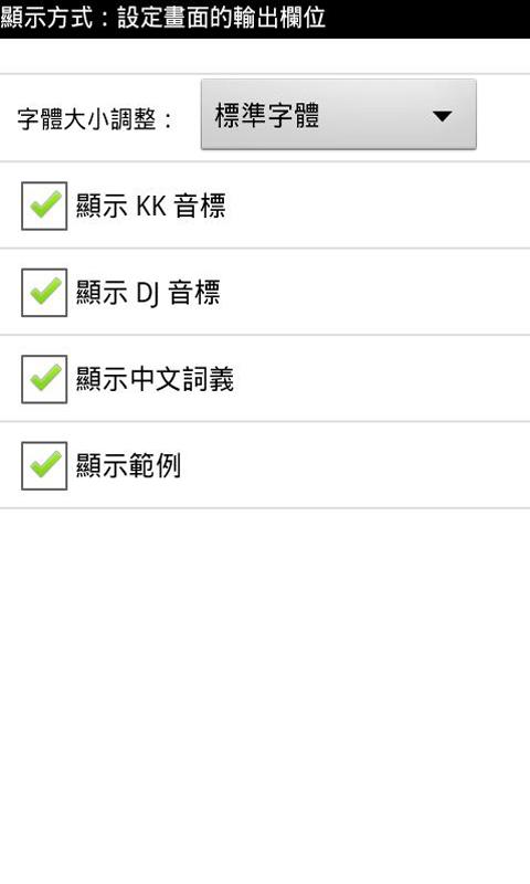 5.字體大小與音標的設定,本軟體可自行設定字體大小,是否顯示單字範例、KK音標、DJ音標。