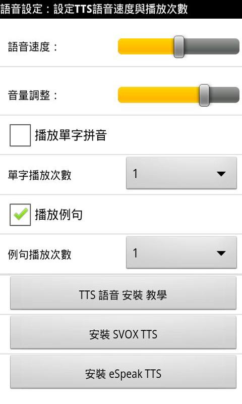 如果您安裝後沒有聲音,或是按下『播放』鈕後,單字快速往下跑,或是單字拼音時有奇怪的發音、發音不好聽,表示您的『TTS語音』未安裝、設定錯誤、或是目前使用的TTS無法完全支援您的手機,請更換不同版本的『TTS語音』。