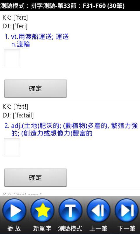 獨創的單字測驗模式,不只測驗中文解釋、英文單字拼音、還可以測驗聽力,學習成效立即呈現!