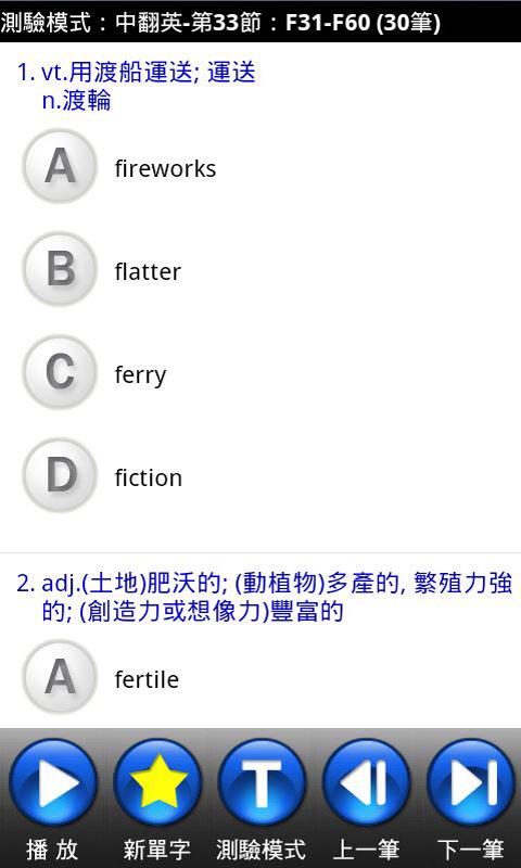 目前提供的測驗模式:『中翻英』、『英翻中』、『拼字測驗』、『模擬試題』,歡迎您來挑戰!