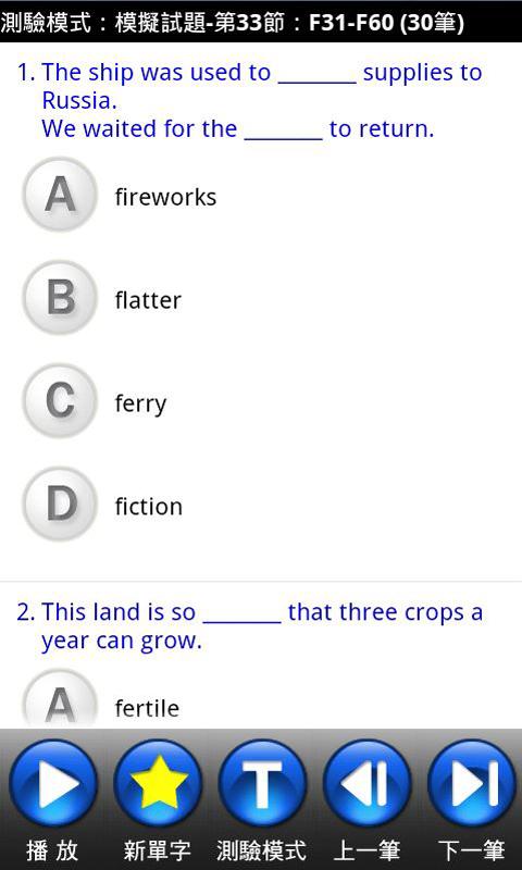 目前提供的測驗模式:『中翻英』、『英翻中』、『拼字測驗』、『模擬試題』,歡迎您來挑戰!