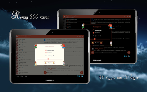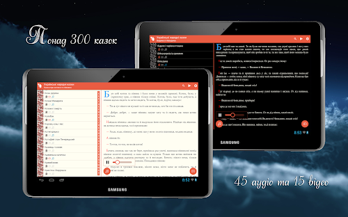 Кількість казок та відповідно аудіо і відео з часом буде збільшуватися. Все залежить від вас.|> More than 300 Ukrainian folk tales, of which 45 with audio soundtrack and 15 of the video.