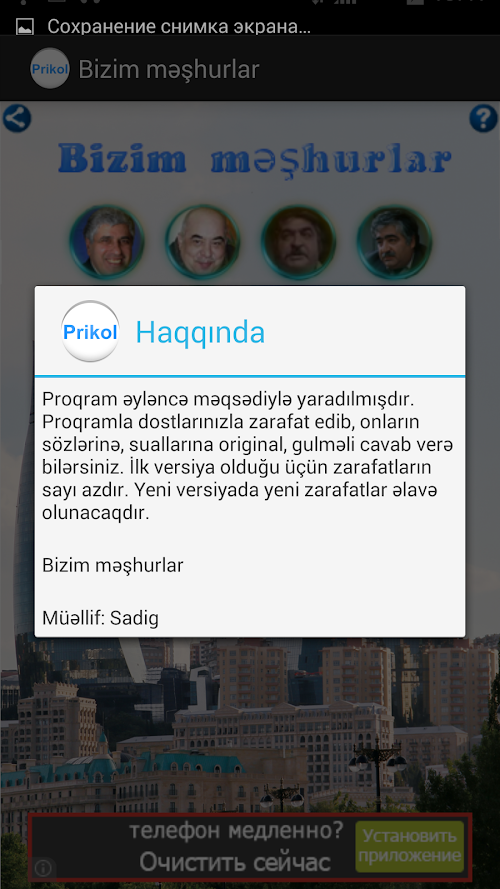 Proqramda bizim məşhurların gülməli, əyləncələri səsləri toplanmışdır. Hər bir şəkil butonunun üzərinə tıkladıqda həmin aktyora uyğun məzəli kəlməni dinləyə bilərsiniz.Proqram əyləncə məqsədiylə yaradılmışdır. Proqramla dostlarınızla zarafat edib, onların sözlərinə, suallarına original, gulməli cavab verə bilərsiniz. İlk versiya olduğu üçün zarafatların sayı azdır. Növbəti versiyalarda yeni zarafatlar əlavə olunacaqdır. Bizi izləyin.