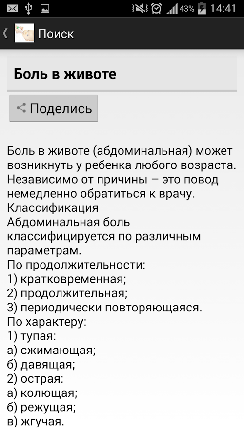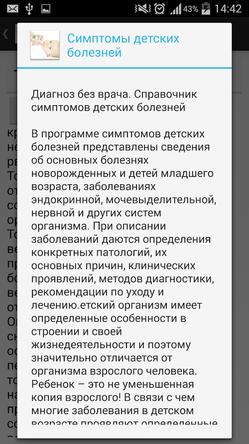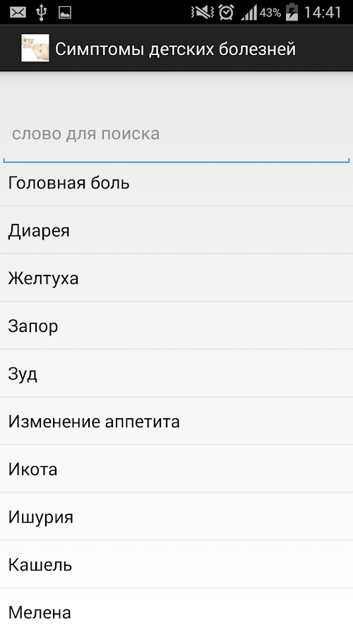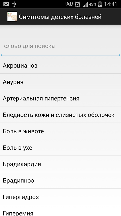 В программе вы найдете информации о Симптомы заболеваний: Акроцианоз, Анурия, Артериальная гипертензия, Бледность кожи и слизистых оболочек, Боль в животе, Боль в ухе, Брадикардия, Брадипноэ, Гипергидроз, Гиперемия, Гиперестезия, Гиперсаливация, Гипертермия, Головная боль, Диарея, Желтуха, Запор, Зуд, Изменение аппетита, Икота, Ишурия, Кашель, Мелена, Метеоризм, Мокрота, Насморк, Никтурия, Одышка, Озноб, Олигурия, Отеки, Отрыжка, Полидипсия, Полиурия, Полифагия, Потница, Снижение массы тела, Стридор, Судороги, Сыпь, Тахикардия, Тахипноэ, Тошнота, Тремор, Увеличение лимфатических узлов, Увеличение массы тела сверх возрастной нормы, Хлороз, Цианоз, Синдром общей интоксикации организма, Диспепсический синдром, Бронхообструктивный синдром, Нефротический синдром, Геморрагический синдром, Абдоминальный синдром, Гипертермический синдром, Судорожный синдром, Гипертензивный синдром, Гиповолемический синдром, Асфиксия, Бленнорея, Гемолитическая болезнь, Кривошея, Омфалит, Пупочная грыжа, Эпидемическая пузырчатка, Врожденный сифилис, Экссудативно-катаральная аномалия конституции, Лимфатико-гипопластическая аномалия конституции, Нервно-артритический диатез, Анемии, Железодефицитная анемия, Фолиеводефицитная анемия, В12-дефицитная анемия, Гиповитаминозы, Гипервитаминозы, Рахит, Спазмофилия, Гипотрофия, Пороки сердца, Стеноз устья аорты, Открытый артериальный проток, Дефект межжелудочковой перегородки, Тетрада Фалло, Стеноз левого предсердно-желудочкового отверстия, Недостаточность аортального клапана, Гастродуоденит, Холецистит, Дисбактериоз кишечника, Язвенная болезнь, Болезнь Гиршпрунга, Болезнь Крона, Неспецифический язвенный колит, Цистит, Пиелонефрит, Гломерулонефрит, Хронический гломерулонефрит, Хроническая почечная недостаточность, Гипотиреоз, Диффузный токсический зоб, Аутоиммунный тиреоидит Хашимото, Ожирение, Сахарный диабет, Гипопаратиреоз, Хроническая недостаточность коры надпочечников, Гипопитуитаризм, Детский церебральный паралич, Гидроцефалия, Эпилепсия, Энурез, Заикание, Нервный тик, Системная красная волчанка, Системная склеродермия, Дерматомиозит, Инфекционный артрит, Ревматоидный артрит... Diagnosis without a doctor. The symptoms of childhood diseases.