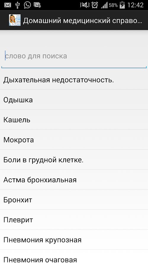 В программе вы найдете: Дыхательная недостаточность, Одышка, Кашель , Мокрота, Боли в грудной клетке , Астма бронхиальная, Бронхит, Плеврит, Пневмония крупозная, Пневмония очаговая, ЗАБОЛЕВАНИЯ ЖЕЛУДОЧНО-КИШЕЧНОГО ТРАКТА, Гастрит острый, Гастрит хронический, Гепатит, Желчнокаменная болезнь, Желудочное и кишечное кровотечения, Цирроз печени, Язвенная болезнь желудка и двенадцатиперстной кишки, ЗАБОЛЕВАНИЯ ПОЧЕК, Нефрит острый, Нефрит хронический, Пиелонефрит, Почечнокаменная болезнь, ЗАБОЛЕВАНИЯ КРОВИ, Анемии, Гемобластозы, ЭНДОКРИННЫЕ ЗАБОЛЕВАНИЯ, Диффузный токсический зоб и гипотиреоз, Ожирение, Сахарный диабет, ЗАБОЛЕВАНИЯ СЕРДЕЧНО-СОСУДИСТОЙ СИСТЕМЫ, Атеросклероз, Гипертоническая болезнь, Ревматизм, Хроническая сердечная недостаточность, Стенокардия, ЗАБОЛЕВАНИЯ ИНФЕКЦИОННОЙ ПРИРОДЫ, Ботулизм, Сибирская язва, Скарлатина, Столбняк, Холера, РОСТ И РАЗВИТИЕ ЗДОРОВОГО РЕБЕНКА, НЕДОНОШЕННЫЙ РЕБЕНОК И УХОД ЗА НИМ, ЗАБОЛЕВАНИЯ НОВОРОЖДЕННЫХ И ДЕТЕЙ ПЕРВОГО ГОДА ЖИЗНИ, Внутриутробные заболевания, Врожденные пороки развития, Гемолитическая болезнь новорожденных, Токсоплазмоз, Цитомегалия, Гидроцефалия, Родовые травмы, Особенности заболеваний новорожденных в первые недели жизни, Заболевания кожи и пупка, Колибациллярдоя инфекция, Рахит, Спазмофилия, ЗАБОЛЕВАНИЯ ОРГАНОВ ДЫХАНИЯ У ДЕТЕЙ, Острые респираторные заболевания, Ангины, Аденоиды, Хронический тонзиллит, Воспаление легких (пневмония), ЖЕЛУДОЧНО-КИШЕЧНЫЕ ЗАБОЛЕВАНИЯ У ДЕТЕЙ, Простая (нетоксическая) диспепсия, Парентеральная диспепсия, Токсическая диспепсия, Кишечная инвагинация (непроходимость), Пилоростеноз, Дистрофия, Аппендицит, Гельминтозы, ЗАБОЛЕВАНИЯ НЕРВНОЙ СИСТЕМЫ, Менингококковый менингит, Гнойный вторичный менингит, Острый серозный лимфоцитарный менингит, Острый энцефалит, Полиомиелит, Неврозы, Ушибы и сотрясения мозга, Диатезы, Астматический бронхит, бронхиальная астма, Дифтерия, Скарлатина, Корь, Краснуха, Инфекционная эритема, Коклюш, Ветряная оспа, Эпидемический паротит, Грипп, Дизентерия, КРОВОТЕЧЕНИЕ, ОЖОГИ, Термические ожоги кожи, Химические ожоги кожи, ОТМОРОЖЕНИЯ, Перелом костей предплечья, Повреждение лучезапястного сустава и кисти, Переломы ребер, Переломы позвоночника, Переломы костей голени, Бинтовые повязки, Неподвижные повязки, Приступ стёнокардии, Сердечные неврозы, Инфаркт миокарда, БРОНХИАЛЬНАЯ АСТМА, Астматическое состояние, КОЛЛАПС, КОМАТОЗНЫЕ СОСТОЯНИЯ, ПОРАЖЕНИЕ МОЛНИЕЙ, ОБМОРОК, ОТРАВЛЕНИЕ, Алкогольное отравление, Отравление окисью углерода, Отравление уксусной эссенцией, Отравление фосфорорганическими соединениями (хлорофос, тиофос, карбофос и др), Отравление барбитуратами, Отравление атропином (белладонной, беллоидом, белласпоном и др), Отравление нейролептиками (аминазин, трифтазин, тизерцин и др), Отравление антигистаминными препаратами (димедрол, дипразин (пипольфен), супрастин и др), Отравление транквилизаторами (элениум, диазепам, седуксен, сибазон, оксазепам, тазепам, нозепам), ПОВЕШЕНИЕ, ПОРАЖЕНИЕ ЭЛЕКТРИЧЕСКИМ ТОКОМ НАПРЯЖЕНИЕМ ВЫШЕ 50 В, ПОЧЕЧНАЯ КОЛИКА, РОДЫ ВНЕ СТАЦИОНАРА, СЕРДЕЧНАЯ АСТМА, СОЛНЕЧНЫЙ УДАР, СУДОРОГИ ЭПИЛЕПТИЧЕСКИЙ ПРИПАДОК, СУДОРОЖНЫЙ ПРИПАДОК ПРИ ИСТЕРИИ, ТЕПЛОВОЙ УДАР, ДОВРАЧЕБНАЯ РЕАНИМАЦИЯ, Массаж сердца, "Home Medical Handbook" - a popular guide that makes the initial master medical knowledge and then apply them in practice. Edition introduces you to the mo