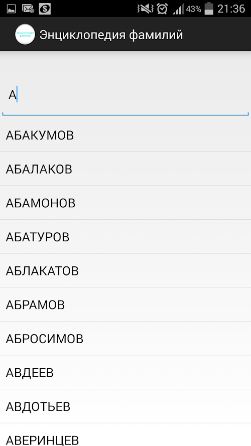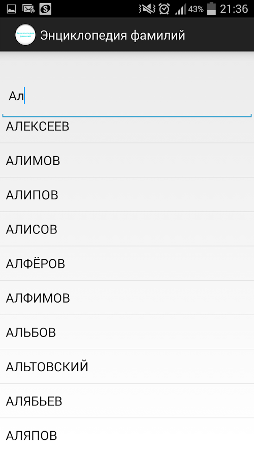 This program helps you learn the meaning and origin of your surname. Thanks to our programmae you can find out where your ancestors come from and what they were doing, and probably had some character, because Russian names - a real encyclopedia of life, history and ethnography of the Russian people. Each name - a kind of mystery, and it is not easy to solve. Try it and you'll catch that unique moment of history from which to start your race.