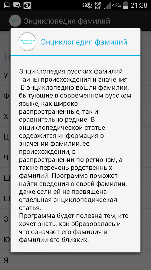 В энциклопедической статье содержится информация о значении фамилии, ее происхождении, в распространении по регионам, а также перечень родственных фамилий. Программа поможет найти сведения о своей фамилии, даже если ей не посвящена отдельная энциклопедическая статья.Encyclopedia of Russian surnames. Secrets of the origin and meaning ...