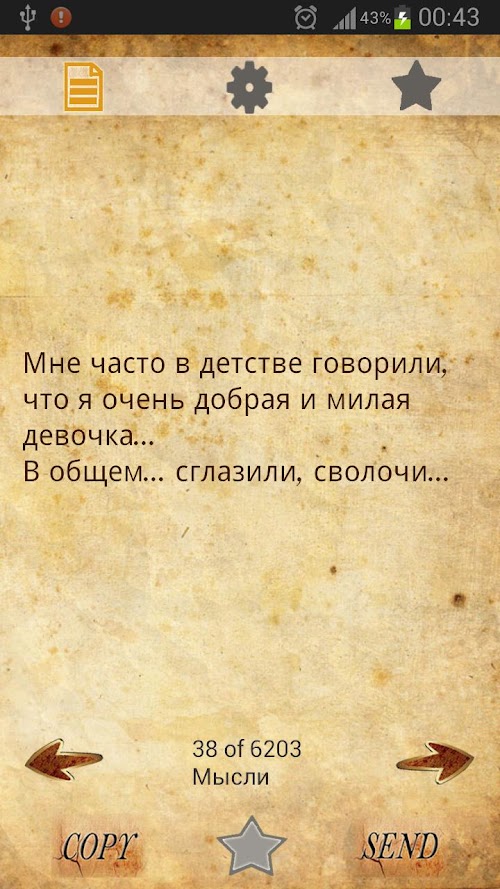 You can also add your favorite quote in your favorites, copy, send sms, on vkontakte or other applications.