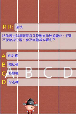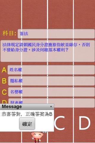 國考闖天關,是一個練習國家考試題庫的有趣App,目前科目有國文、英文、法學緒論、中華民國憲法,畫面上會隨機出現考題,玩家必須在時限內選擇答案,利用手機或平板電腦的陀螺儀,控制裝置的搖晃來操縱狀元小幫手,讓小幫手接觸到想要的選項答案,可以讓學習不再枯燥乏味,不但能達到檢測學習成效的目的,更能讓考生有新鮮感,考生們就不會把做題目當做一件痛苦的事,而能充份enjoy學習的成就感。 State Examination Blast is a national exam practice interesting App, currently subjects Chinese, English, Introduction to Law, the ROC Constitution, the exam will randomly appear on the screen, the player must select an answer within the time limit, using a mobile phone or tablet gyroscope control device to manipulate champion shaking little helper, so little helper come into contact with the desired option answers, allowing learning is no longer boring, not only can achieve the purpose of detection of learning, but also allow candidates to have fresh, Candidates who do not put title as a painful thing, but can fully enjoy learning achievement.