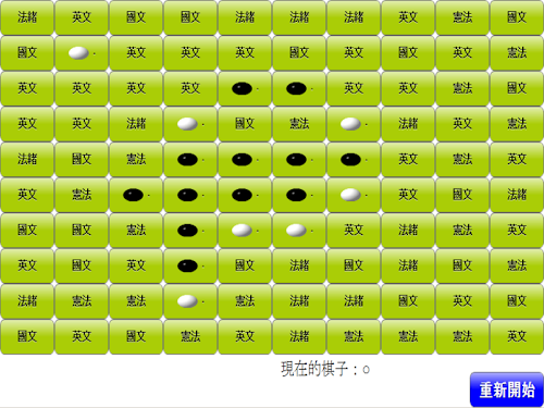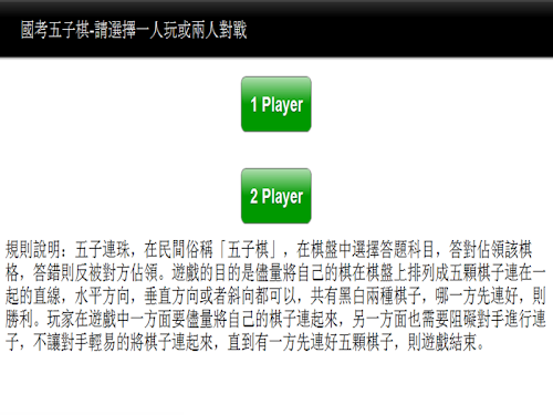 規則說明:使用者可以單選或複選您正在準備的考科,打造專屬自己的遊戲,選好自己的考科後,選擇的科目會自動隨機散佈在棋格內,玩家選定答題的棋格,答對佔領該棋格,答錯則反被對方佔領。遊戲的目的是儘量將自己的棋在棋盤上排列成五顆棋子連在一起的直線,水平方向,垂直方向或者斜向都可以,共有黑白兩種棋子,哪一方先連好,則勝利。玩家在遊戲中一方面要儘量將自己的棋子連起來,另一方面也需要阻礙對手進行連子,不讓對手輕易的將棋子連起來,直到有一方先連好五顆棋子,則遊戲結束。