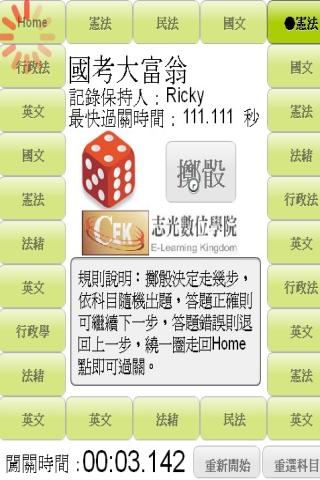 遊戲方式:選好自己的考科後,選擇的科目就會平均分配於大富翁的棋格內,從起點開始,透過擲骰子的方式,依照所擲點數,前進該點數的方格內,並回答該方格內考科隨機選取的題目,答對就可繼續前進,答錯就必須退回原方格內,依照此模式,盡可能以最快的速度回到起點,就可過關,並計算所花費時間。