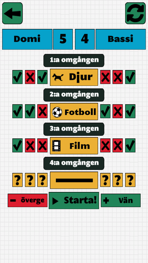 Kategori väljs växelvis, så att Du har chans att välja den kategori, som du är bäst på och Din motståndare något mindre.