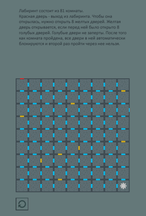Лабиринт состоит из 81 комнаты. Красная дверь - выход из лабиринта. Чтобы она открылась, нужно открыть 8 желтых дверей. Желтая дверь открывается, если перед ней было открыто 8 голубых дверей. Голубые двери не заперты. После того как комната пройдена, все двери в ней автоматически блокируются и второй раз пройти через нее нельзя. Ваша задача, следуя этим правилам, выбраться из лабиринта. Удачи!The maze consists of a room 81. Red door - out of the maze. To open it, open the yellow doors 8. Yellow door opens, if it was open before 8 blue doors. Blue doors are not locked. Once the room is passed, all doors are automatically locked in it and the second time it is impossible to get through. Your task, following these rules, get out of the maze. Good luck!