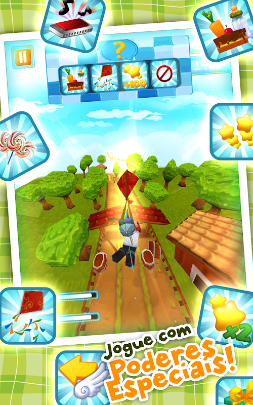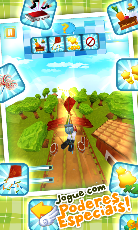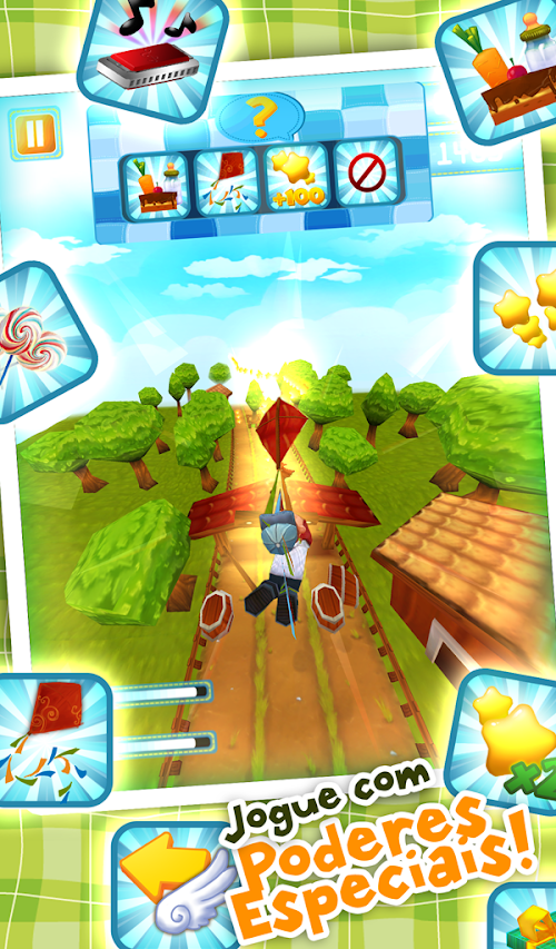 Corra o mais rápido que puder. Pegue estrelas, presentes, figurinhas e pirulitos para aumentar as habilidades do seu personagem. Pule, escorregue e desvie dos obstáculos para fugir de quem quer te pegar.