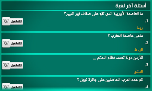 - إمكانية مراجعة جميع أسئلة آخر لعبة و أجوبتها و قراءة معلومات و تفاصيل إضافية متعلقة بالسؤال ( لقراءة المعلومات الإضافية يجب أن تتوفر على إتصال بالنت)