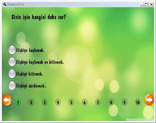 Aldatmak ve aldatılmak... Her ilişki için potansiyel bir durum sayılmaz mı? Bir ilişkiniz olsun olmasın, bakın bakalım aldatma ve aldatılmaya ne kadar yakın olabilirsiniz. Var mısınız teste?Deceive and be deceived ... Every relationship does not count for a potential situation? Whether or not a relationship, let's see how close you can be to deceive and be deceived. Are you up to the test?