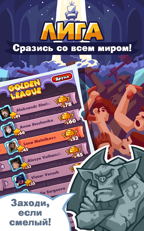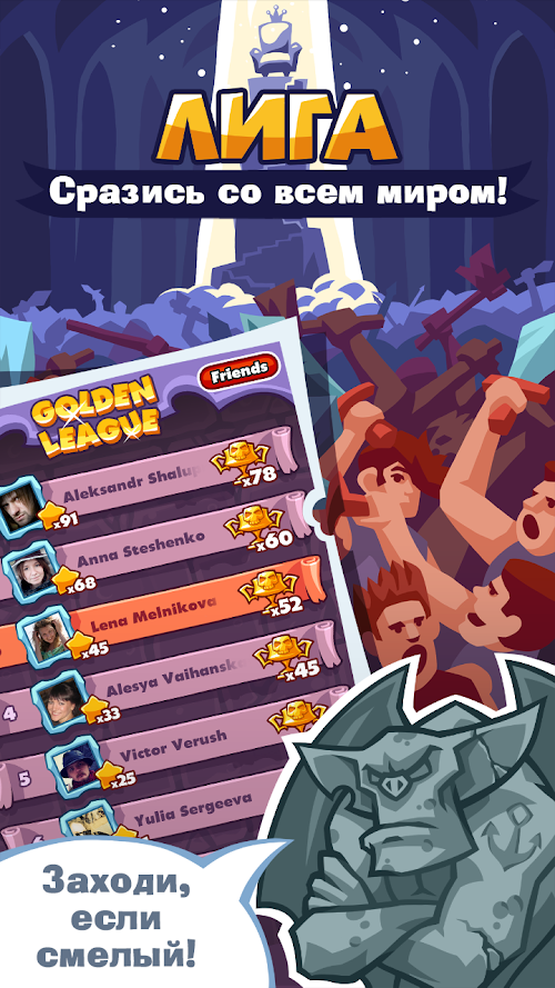 * Возможность продвигайся по лигам, от деревянной до алмазной, на своем пути к титулу чемпиона!