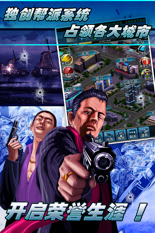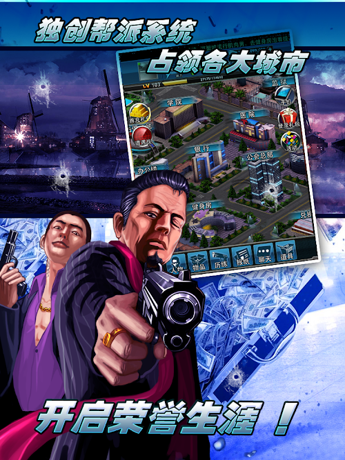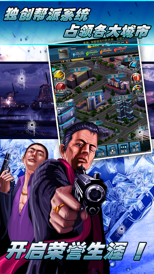 作为一款以帮会为核心玩法并融入了战斗和商业经营两条主线的现实题材游戏,玩家将以一个小人物的身份和所有玩家一同出现在河蟹城当中,大家一起通过战斗抢地盘、历练挑战以及商业经营不断的壮大自己,从而成为游戏中的风云人物和一帮霸主。
