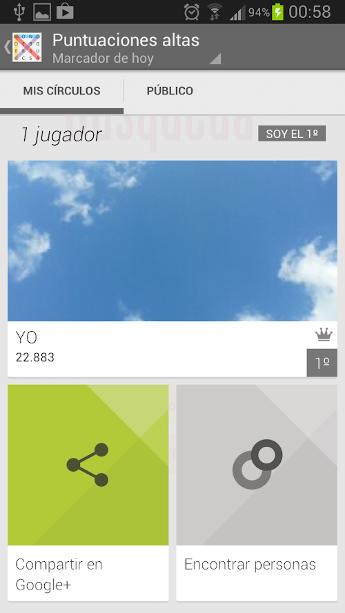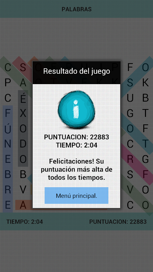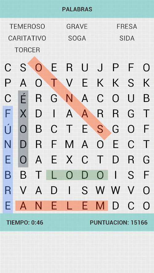 The score is calculated based on the length of the words found and the time elapsed. When you find all the words in the puzzle, the score is sent to the online scoreboard on Google+. You can see the best players every day, every week or for all time.