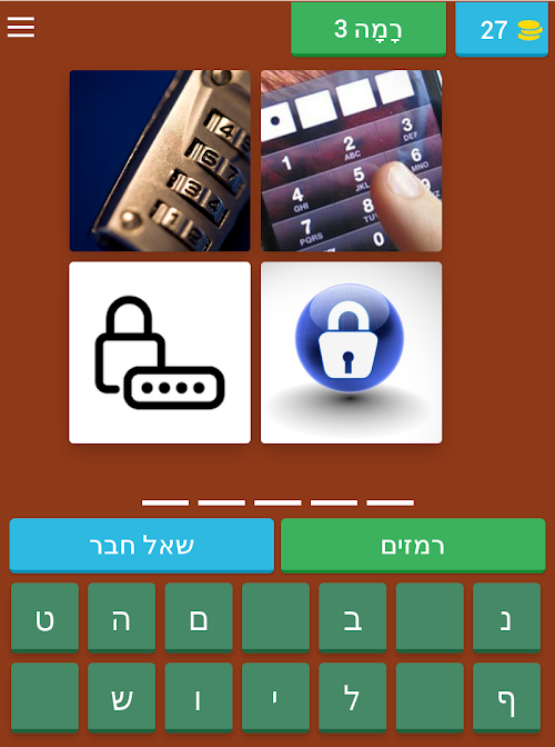 במשחק הזה, בארבע התמונות צריכות לנחש את הכולל בתוך המשמעות של המילה.In this game, the four images to guess the total within the meaning of the word.