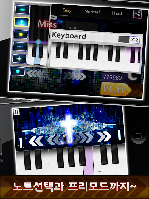 악보가 없어도 노트가 내려오면 리듬을 맞춰 피아노를 연주해보세요.(리듬게임방식)