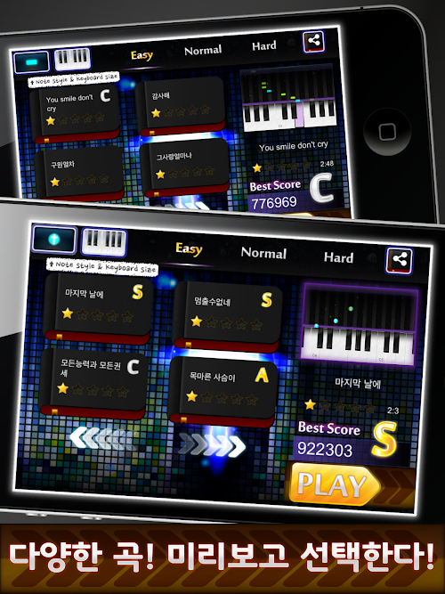 - EASY,NORMAL,HARD,HELL 4개의 난이도 별 100여 곡 수록 (모차르트,베토벤 유명 작곡가 클래식)
