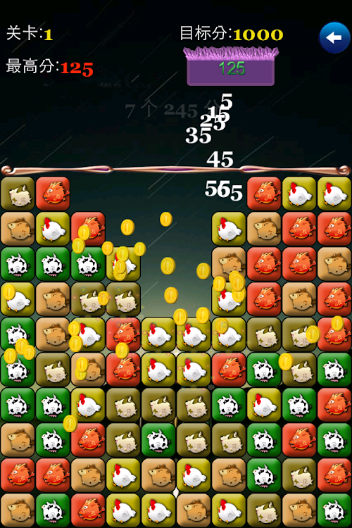 1: At least two of the same can be eliminated together fruits, and to obtain the corresponding points, elimination of the fruit, the more the higher the score. (First fruits five points, second 15 points, third 25 points, fourth 35 points ......).