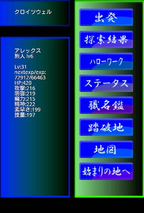 1.50...エンディング後のおまけマップ追加。オプション(ヘルプ、名前変更など)追加。ステータスにスキルの情報表示