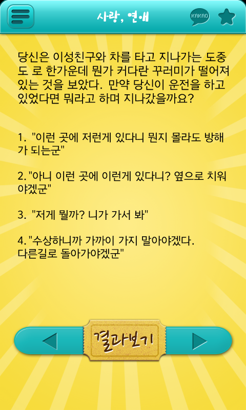 친구에게 카카오톡으로 심리테스트 문제를 내고 답도 보내보세요. ^^