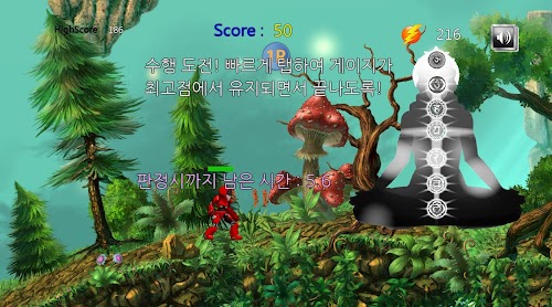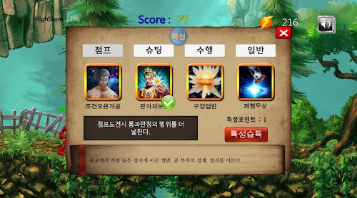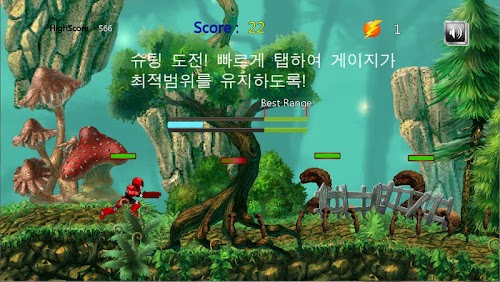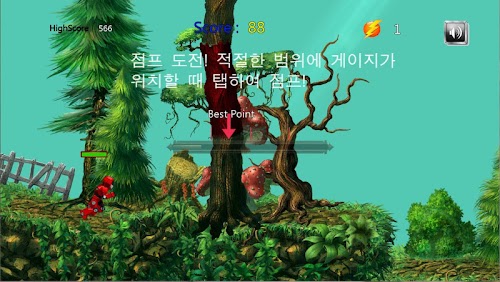 점프게이지가 올라갈때는 가만히 지켜보고 있다가, 그 게이지가 최적의 눈금에 왔을 때, 터치하면 점프합니다. 그러나 게이지는 시간이 지나면 사라지므로 마음속으로 현재의 위치를 가늠해야 합니다.