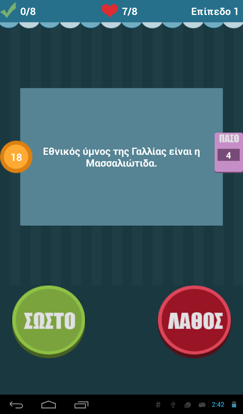 Σας ευχόμαστε καλή διασκέδαση με την εφαρμογή ΣΩΣΤΟ Η ΛΑΘΟΣ. Για προτάσεις και παρατηρήσεις σχετικά με την εφαρμογή, μη διστάσετε να επικοινωνήσετε μαζί μας στο [email protected] From the creators of your favorite games, and Eureka Millionaire came the new fun and educational game! True or False?