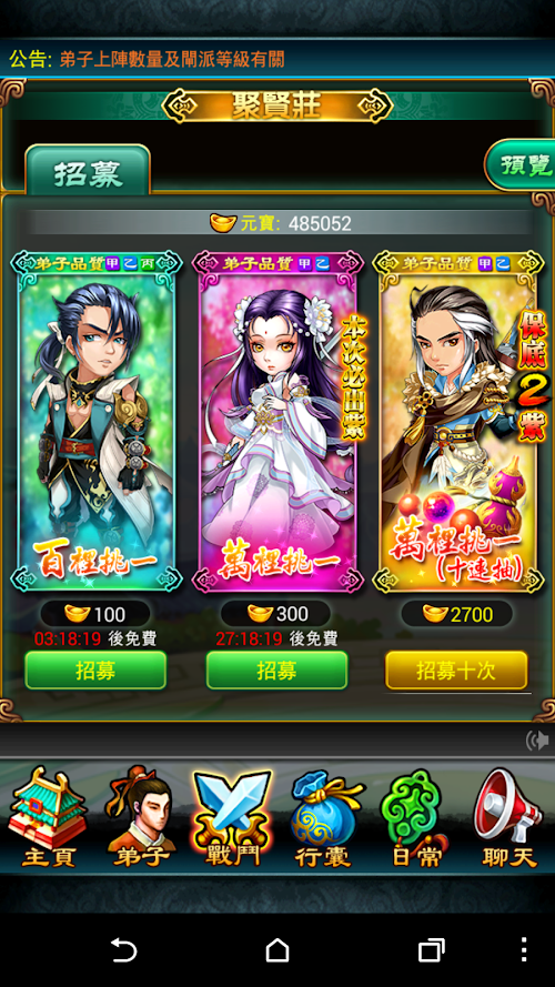 6、新角色使用聚賢莊抽將時,新增冷卻時間,分別是30分鐘和6小時