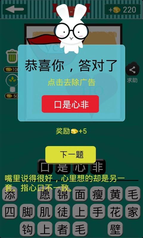 游戏规则很简单,只要根据所显示的图片按顺序选择方框文字组成成语即可过关,看图猜成语,你能过几关?Figure 3 is a guess idioms idioms Doodle Studio plug-guess the third edition of the series, this series is more difficult than the previous two series, the authors carefully selected four-wave picture of 160 questions, the subsequent week launched a wave.