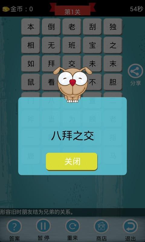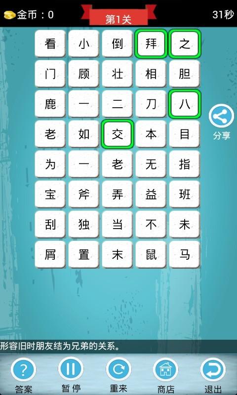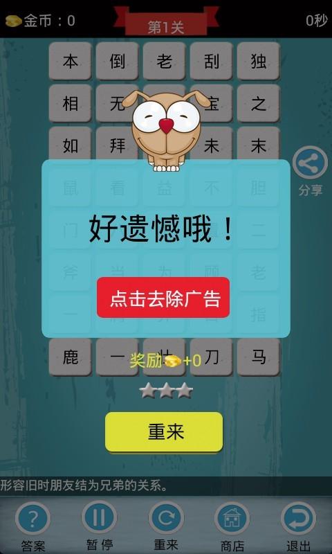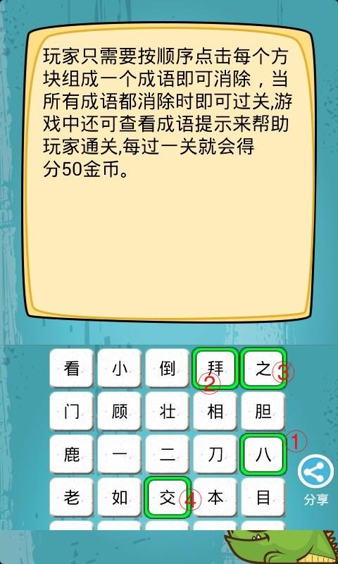 快来一起消消看吧,疯狂成语消消看,你能怎么消?Idiom Diminshing see is a puzzle and casual eliminate class game, the game players need only point in the order of 4 words in a phrase can be eliminated, he is not equivalent to the elimination of the stars in general, but also from lianliankan of touch, it is a challenge to help eyesight and idiom knowledge of the game, players can not only play in the process to bring the game fun, but also learn a lot of knowledge of idioms.