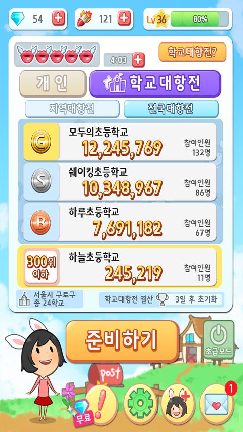 >> 초등학교, 중학교, 고등학교를 선택하고 지역 혹은 전국에 있는 다른 학교 친구들과 산수 대결!