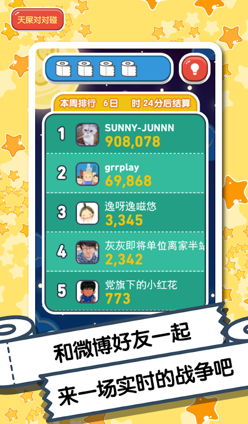 Sina Weibo and your friends together to participate in online real competition, put your best score to share with friends, you'll get the game props: 10 rolls of toilet paper!
