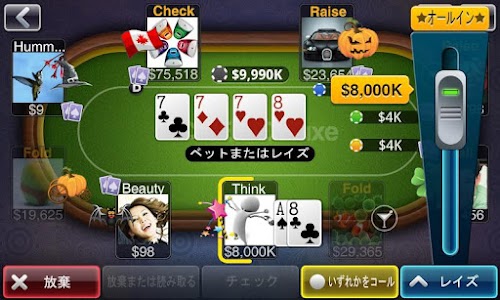 テキサスホールデムポーカーデラックス古典的なゲームプレイ、Facebookの互換性や活発なコミュニティを提供しています。1600万人以上の他のFacebookの選手、iPad、iPhone、およびAndroid使用者と対戦します。これは、ラスベガススタイルのポーカーです!
