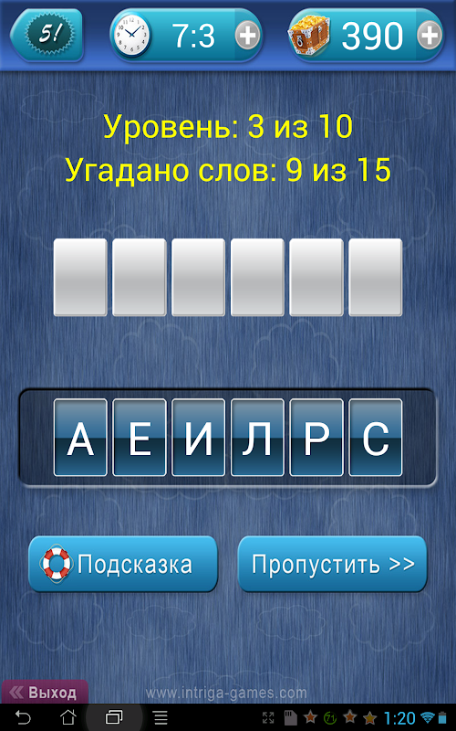 With this game you can to spend time guessing words from shuffled letters. This game is quite simple words, so be warned immediately that it will not work erudite and those who want to sit down and thoroughly incorporate the brain to the fullest :) The game is quite simple and can claim only a fascinating ubivalku time :)