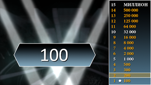 In order to win, you must correctly answer 15 questions from different areas of expertise - the cost of one hundred rubles to one million. Each question has four choices, only one of which is correct. At any time, a player can stop and pick up the money. In the case of an incorrect answer participant gain is reduced to the nearest achieved "fireproof" amount, and he ceases to participate in the game. Become a "Millionaire" to correctly answer all the quiz questions, and to help in this difficult case you are "classic" 3 tips "50:50", "Call a Friend" and "Help the hall."