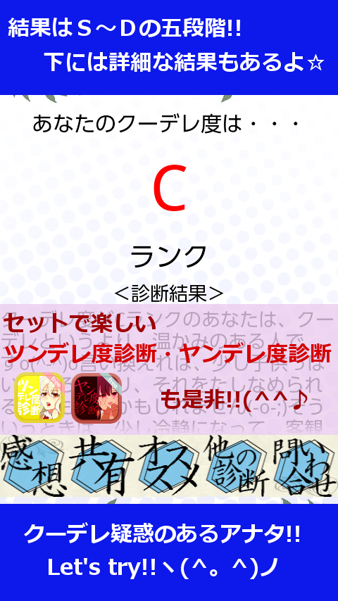 ランダムに出題されるたった10個の心理テストに答えるだけで、あなたのクーデレ度が分かってしまうアプリ!?\(◎o◎)/!