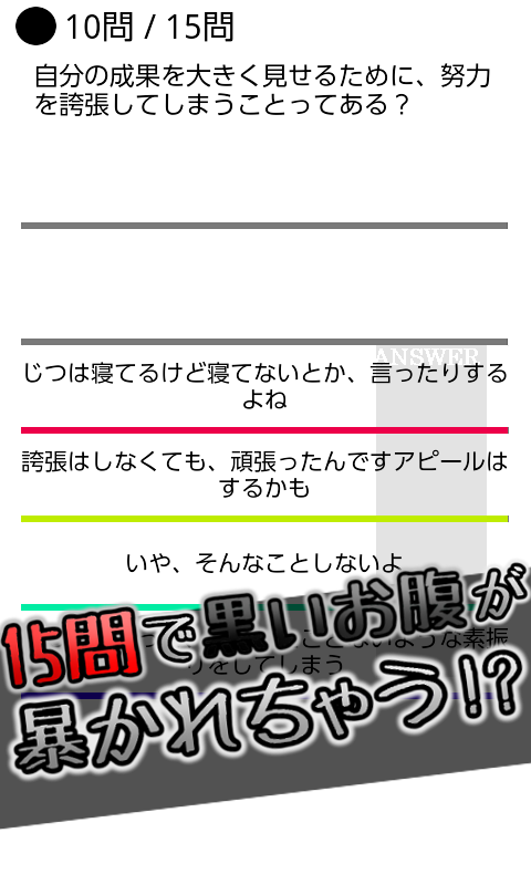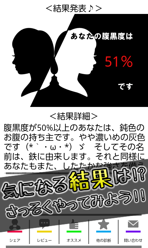 このアプリはランダムに出題される15問の心理テストで回答者の腹黒度を計測できる診断アプリです。
